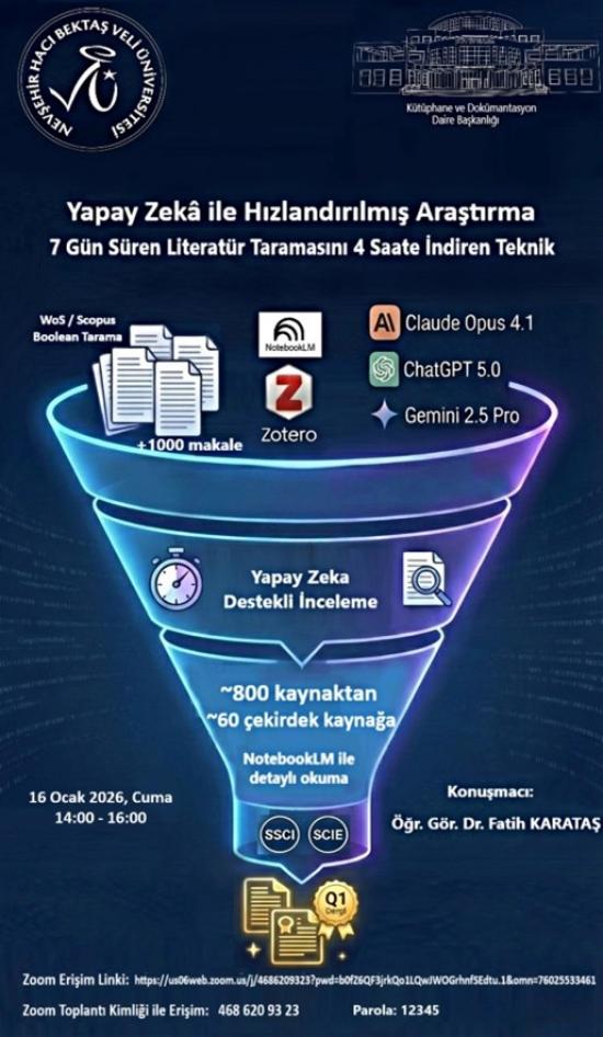Nevşehir Hacı Bektaş Veli Üniversitesi Yabancı Diller Yüksekokulu bünyesinde görev yapan Doç. Dr. Fatih KARATAŞ tarafından "Yapay Zekâ ile Hızlandırılmış Araştırma / 7 Gün Süren Literatür Taramasını 4 Saate İndiren Teknik" konulu eğitim düzenlenmiştir. Eğitimde, WoS ve Scopus veri tabanlarında Boolean arama stratejileri, Zotero ile kaynak yönetimi, yapay zekâ araçlarıyla özet analizi ve NotebookLM ile derinlemesine makale okuma teknikleri ele alınmıştır.
