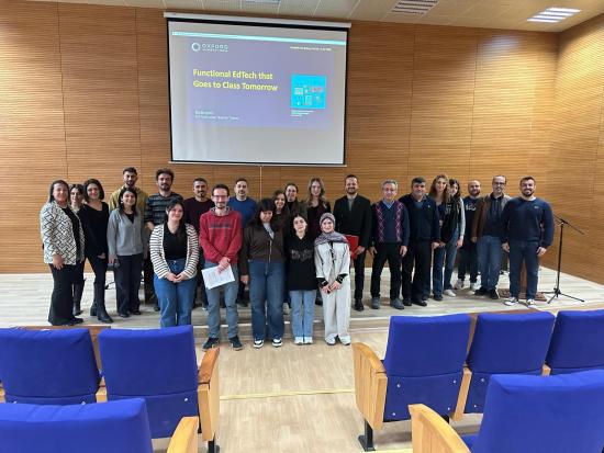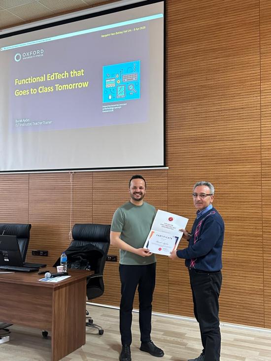NEVÜ Yabancı Diller Yüksekokulu tarafından 09.04.2026 tarihinde düzenlenen One Day Event etkinliği kapsamında OUP işbirliği ile teacher trainer Burak Aydın üniversitemizde ‘Functional EdTech That Goes to Class Tomorrow’ temalı bir etkinlik gerçekleştirmiştir. Etkinliğe Yüksekokulumuz öğretim görevlileri ve hazırlık sınıfı öğrencilerimiz katılmışlardır. Bu etkinlikte, eğitim teknolojisi (EdTech) araçlarını sınıf içi aktivitelere entegre etmeye yönelik pratik, sade stratejiler ele alınmış ve örnek eğitim teknolojisi araçlarının sunumu yapılmıştır.